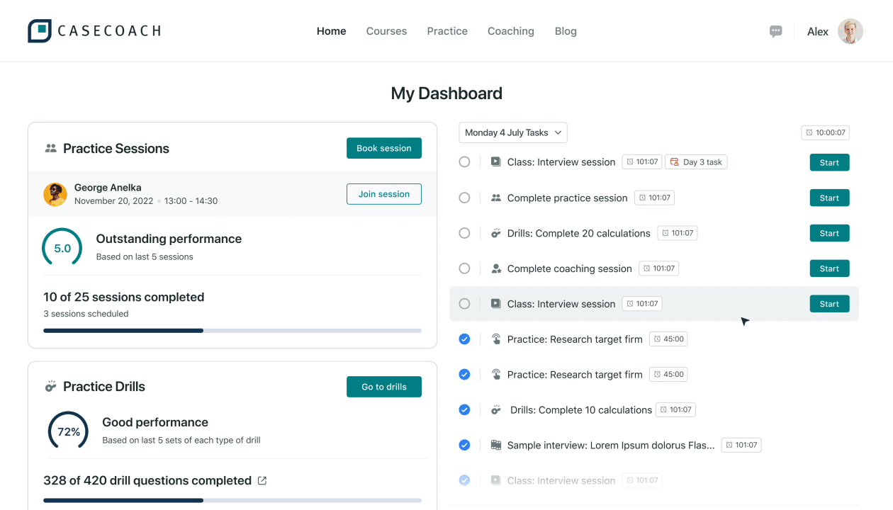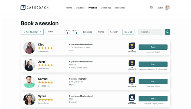In our Practice Room, you can get all the live case interview practice you need to succeed. Book unlimited mock interviews with other top candidates and track your performance.